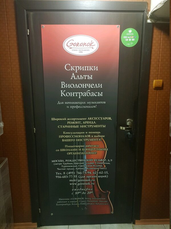 Сервисный сентр Goronok, расположенный по адресу Рождественский бул., 9, стр. 1, Москва предлагает следующие услуги: ремонт музыкальных инструментов. Время работы сервиса: ежедневно, 10:00–20:00.